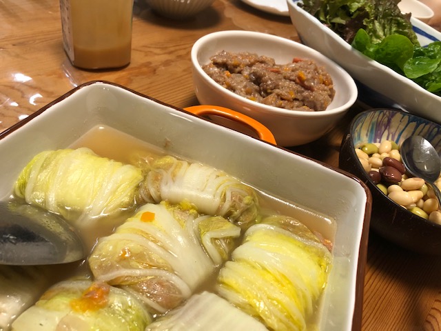 満腹減量 2020年11月18日 栄作の晴れたり曇ったり 雑穀ロール白菜 昨日はヴィーガンランチに夕食は雑穀白菜ロール。完全ヴィーガンデー。お腹いっぱい食べて今朝もまだ満腹感。それなのに体重減。嬉しい美味しさ。今日は晴れ。