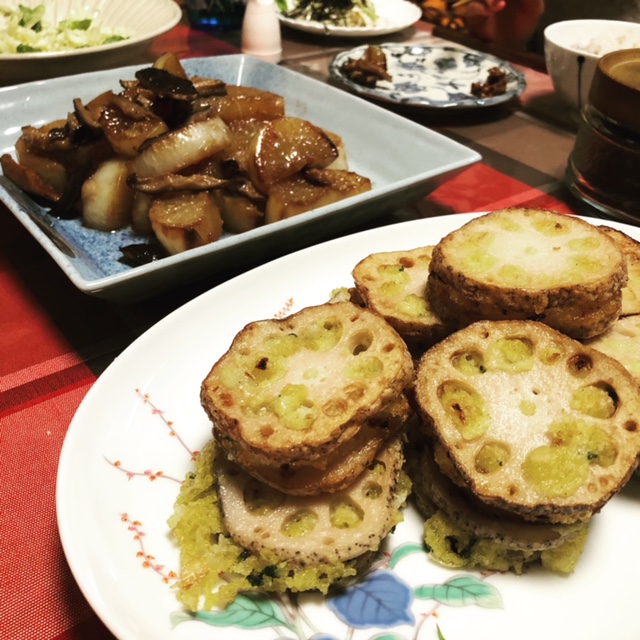 モチキビの蓮根挟み揚げと大根の醤油煮。