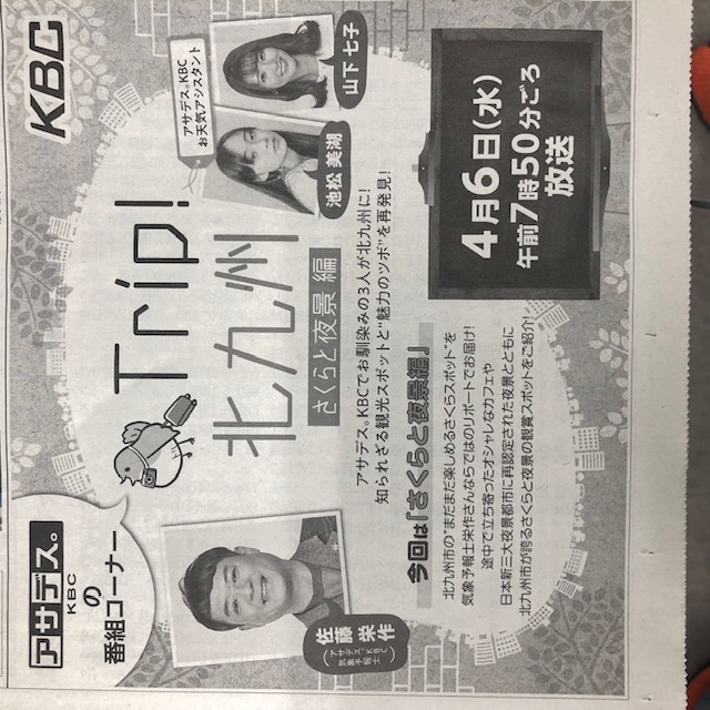 トリップトリップ 2022年04月05日 栄作の晴れたり曇ったり 美湖ちゃん 今日の朝日新聞に広告が出てますが今年度からトリップトリップ北九州は私と七子ちゃん・美湖ちゃんのお天気コンビで担当させていただきます。昨日は美湖ちゃんとロケに行き明日のアサデス。KBCで放送予定です。いつもより笑顔が多いです。多分お楽しみに〜。今日は晴れ、昼過ぎから曇り。 朝日新聞