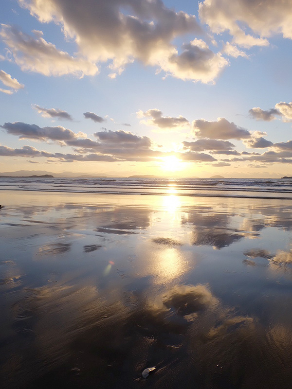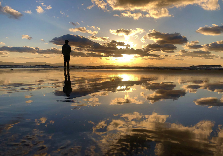 干潮時に砂浜が鏡のように空を反射する神秘的な光景です。