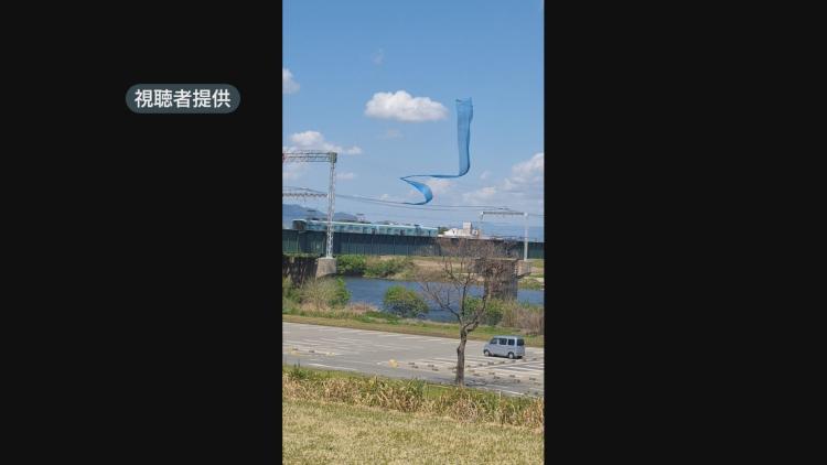 空から落ちてくる、青く細長い物体。風に舞いながら、架線に引っかかり、その直下にいた電車も停車します。
