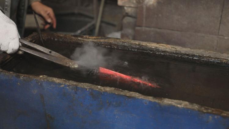 手作業にこだわり、特に焼き入れは、日本刀製作と同様に、800度に熱した鋼を水で急冷却する高度な技術が用いられます。