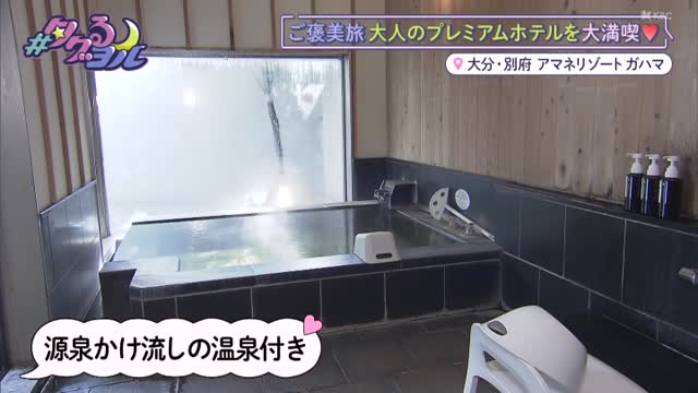 広々としたリビングの奥には和室とウォークインクローゼットまで備え付けられていて、なんと、全ての客室に源泉かけ流しの温泉が付いているのです。「え、お部屋に温泉あるんですか!?」と驚く2人。プライベートな空間で、いつでも好きな時に温泉を楽しめるのは、まさにプレミアムな体験!