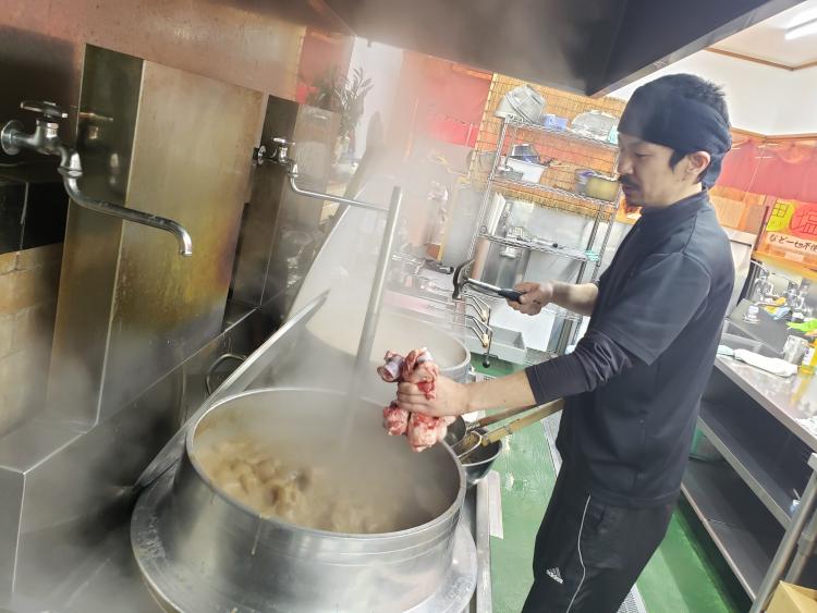 「燃焼容量3万5000kcalの強力なバーナーで臭みやエグミを一気に飛ばします。骨の部位はゲンコツを使い下処理、アク抜きはあえて行いません。その方が豚骨の旨味を余すところなく引き出せますから。追い骨を続けることで濃度がどんどん積み上がっていきます。1杯あたり約1kgの骨が入り、濃度計も一般的な豚骨ラーメンよりはるかに高い27%を指すんですよ」。と三浦さん。豚骨の量もそうだが、強力なバーナーで終始炊き続けるため使用するガスの量も半端ない。開業当初は、ガス業者も予想をはるかに上回る使用量に目を丸くしたそうだ。