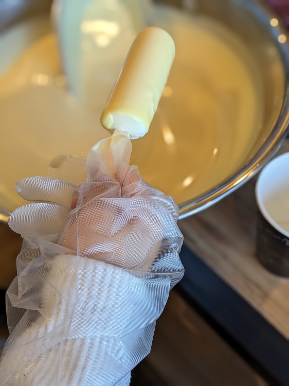 さらにもっと楽しかったのが『至高のアイス』(389円)。こちら、アイスに自分でチョコをたっぷりコーティングできるんです!アイスをチョコレートにつけてしばらくすると、表面が固まってパリパリに!子ども用の踏み台も用意されているので、小さいお子さんでも挑戦できますよ♪アイスはストロベリー、抹茶、マンゴー、ミルク、チョコレートはホワイト、レモン、ミルクから選べます。つまり12種類のアイスが楽しめちゃうということ♪