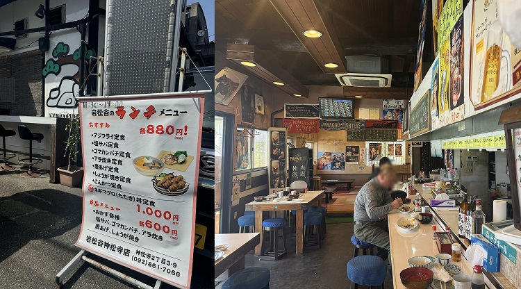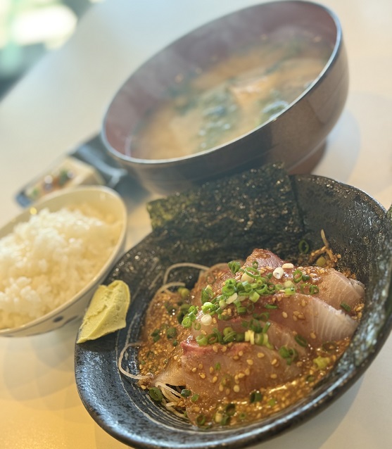 ランチのダントツ人気は「ゴマカンパチ定食」。プリップリで脂の乗ったカンパチが10切れ。ご飯はおかわり自由で、大きいあら汁がついて、お値段880円!カンパチがおいしいのはもちろん、刺身につける自家製のゴマだれが、ご飯によく合う!! 添えられた海苔もゴマだれにたっぷり浸してカンパチと一緒にご飯をかきこめば・・・くぅぅ!手が止まりません。普段あまり食べない人でも、白米のおかわり2杯は必須です!