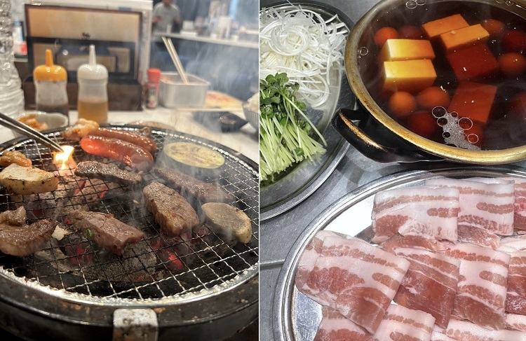 夜の七輪焼肉もホルモン500円~とコスパ抜群!中でも『岩松谷』でしか食べられない「豚ポンしゃぶ」は必食。ポン酢出汁に、これでもか!と盛られた豚肉と一緒に白髪ネギやかいわれをくぐらせていただきます。ミニトマトとうずらの卵も合う!ぜひ食べてみてください。