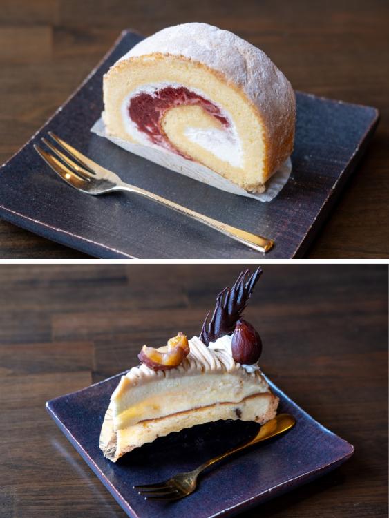 ショーケースには約20品の生菓子、棚には約15品の焼菓子、5品のパンが並びます。中でも人気の5種類のロールケーキは、それぞれの食材を生かした逸品です。
