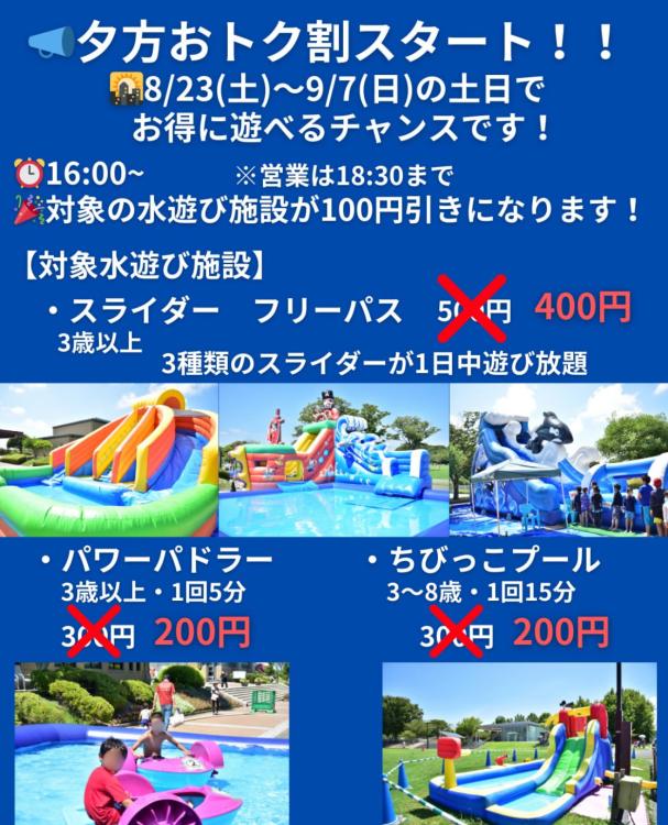 さらに、期間中の土・日曜、祝日は「グリーンパークの水遊び」(10:30~18:30※雨天中止)が楽しめます。現在はお得な「夕方割」を実施中。16:00~18:30の時間帯は3種類のスライダーが1日遊び放題になるフリーパス、ちびっこプール、パワーパドラーが、それぞれ100円引きになります!