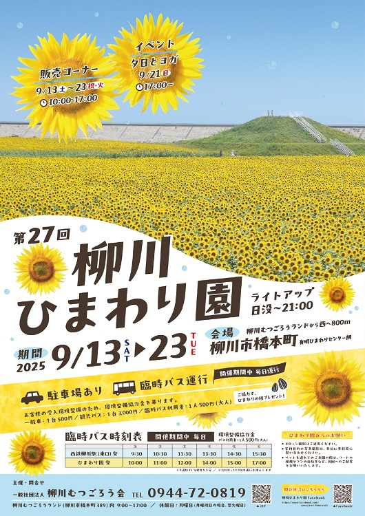 臨時バス:開園期間中毎日、西鉄柳川駅東口から柳川ひまわり園まで運行(利用者1人につき環境整備協力金500円)