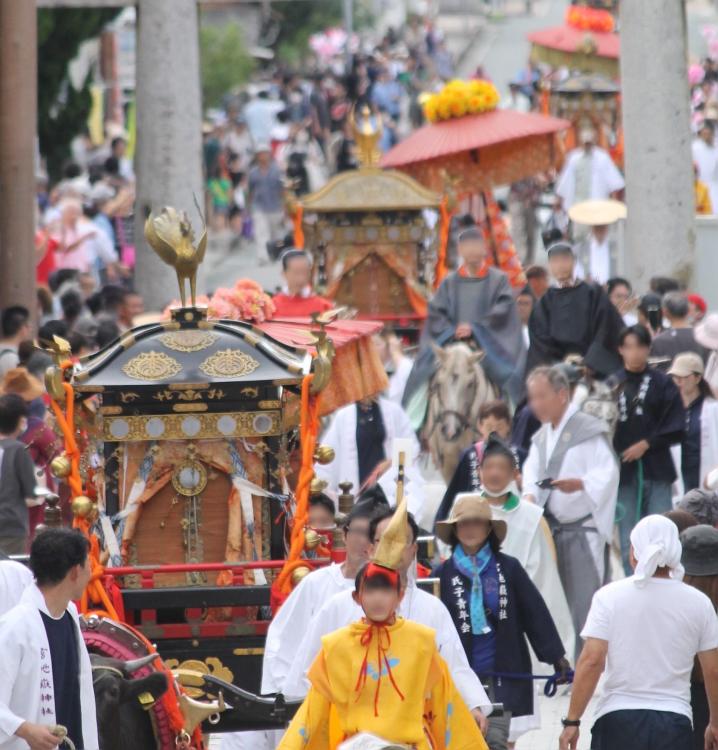 祭王は十二単をまとい、平安絵巻のような「御神幸行列」を率いて、宮地浜~神社の約