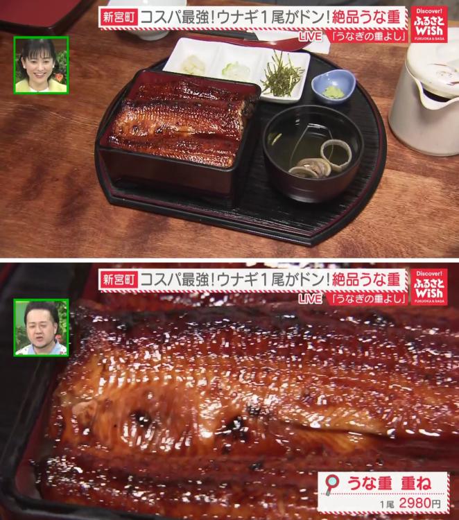 看板メニューは、お重からあふれんばかりのうなぎ1尾が乗った「うな重 重ね」(2980円)。