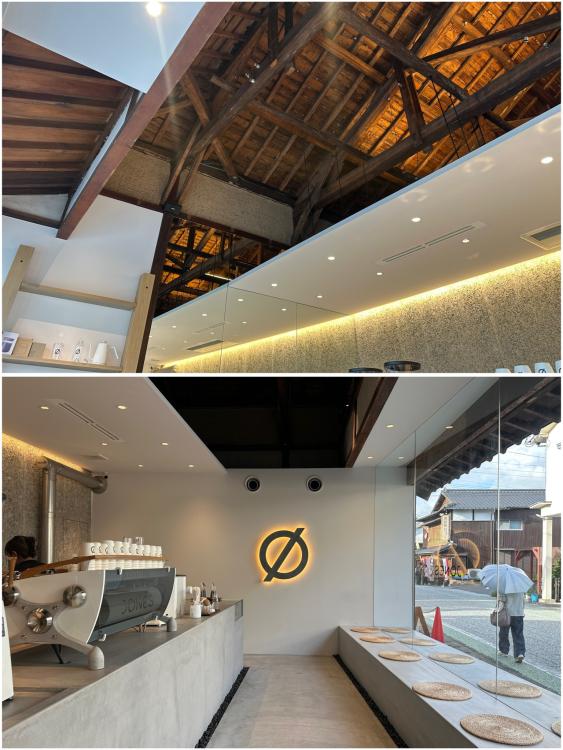 店内は町屋らしい梁や構造を残した天井が印象的で、無駄を省いたミニマルなインテリアと調和しています。