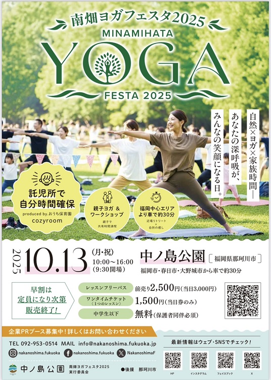福岡県那珂川市にある中ノ島公園で、『南畑ヨガフェスタ』が10月13日(月・祝)に開催されます。川や森に囲まれた公園で、子どもから大人まで楽しめるヨガのイベントです。