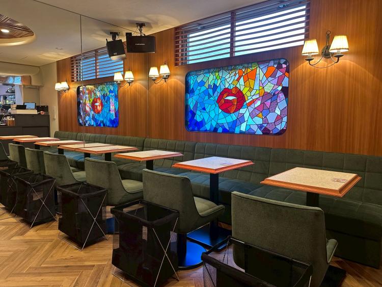 壁にあしらわれたステンドガラスが印象的で、遊び心あるロゴマークとも相まって、思わず写真を撮りたくなるような空間です。