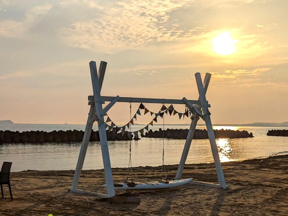 静寂に包まれた早朝、透き通った青い海と秋の空が広がる昼下がり、水面に夕日が映る黄昏時-。いつでもブランコに乗りながら、素敵な写真が撮れますよ♪