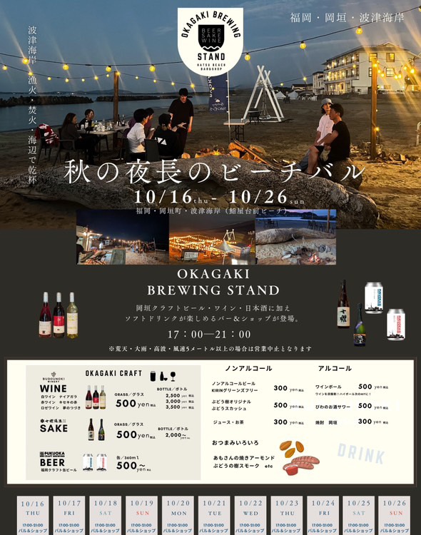 またネーミングキャンペーン期間中、波津海岸では『秋の夜長のほろよいビーチバル』も開催中(17:00~21:00)。岡垣町にある醸造所のクラフトビール、日本酒、ワインなどのお酒や、ジュース、おつまみなどが楽しめますよ。
