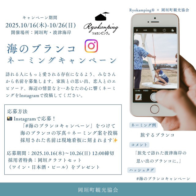 実はこのブランコ、まだ名前がありません。そこで、10月16日(木)から「海のブランコネーミングキャンペーン」がスタート。ぜひあなたが撮ったこのブランコの写真に、思い浮かんだネーミングと波津海岸でのエピソード、そして「#海のブランコキャンペーン」をつけてhttps://www.instagram.com/okagakikankou/に投稿してください。名前が採用されると岡垣クラフトセット(ワイン、日本酒、ビール)がもらえます。応募は10月16日(木)~26日(日)正午まで受け付けています。