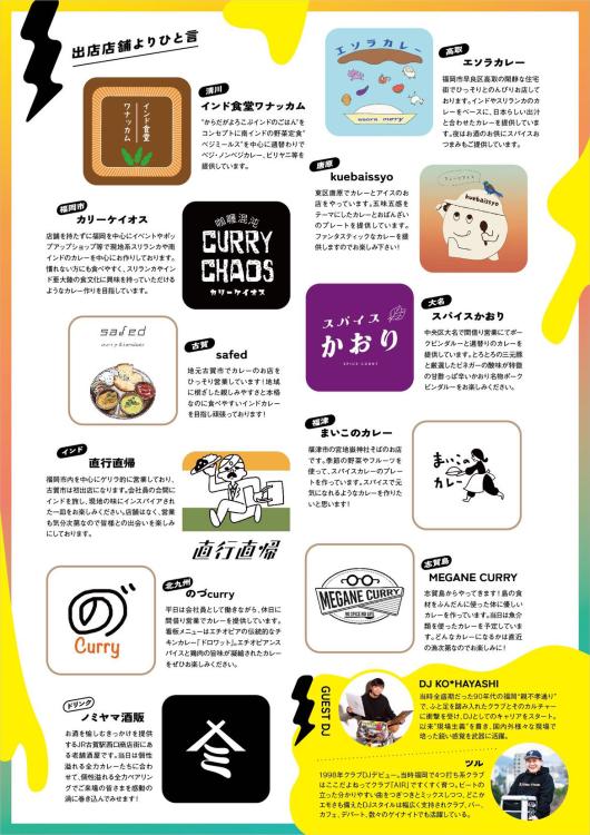 県内各地から、いい意味でカレーやスパイスを語らせるとうるさい、個性豊かで刺激に富んだ10店が出店。どんなカレーになるかは直近の漁次第!志賀島の『MEGANE CURRY』、エチオピアの伝統的なチキンカレーが看板メニュー『のづCurry』、慣れない人にも食べやすいスリランカや南インドカレーを中心に提供している『カリーケイオス』など、各店自慢のカレーを、みなさんに全力で摂取してもらいます!