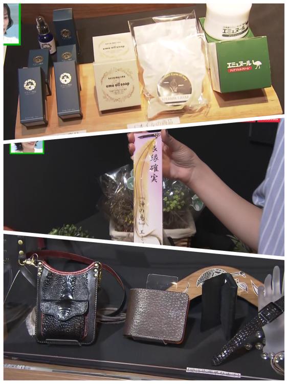 ほかにも、1本の軸から2本の羽が生える珍しい構造から「縁結び」のお守りとされる羽や、柔らかく丈夫なエミューの革で作られたバッグや財布など、珍しい製品が並びます。