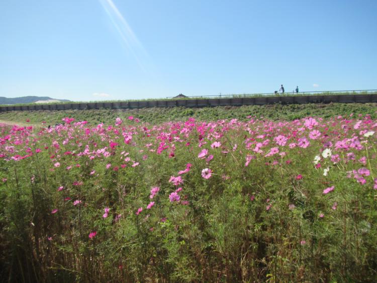 陣屋川の堤防沿いに広がる約2.5kmのコスモス街道やイベント会場のコスモスパーク北野では、約37万本のコスモスがちょうど今、見頃を迎えています。