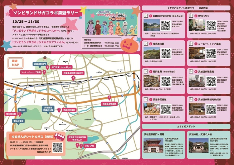 佐賀県武雄市のJR武雄温泉駅南口駅前広場で『タケオハロウィンパーティ2025』が10月25日(土)に開催されます。劇場版『ゾンビランドサガ ゆめぎんがパラダイス』の公開を記念して特別コラボが実現!駅前広場がハロウィン仕様になり、さまざまな企画が繰り広げられます。