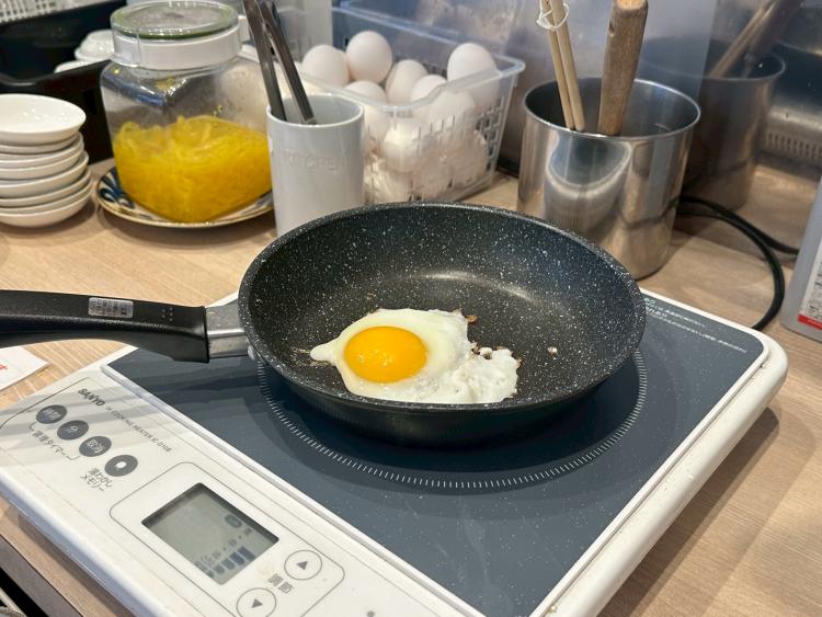 IHと小さなフライパンが並ぶコーナーに、1人1つまでの卵が用意されています。