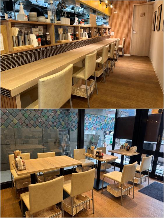 店内はテーブル席とカウンター席があり、どの席にも醤油やソースなどの調味料がスタンバイ。