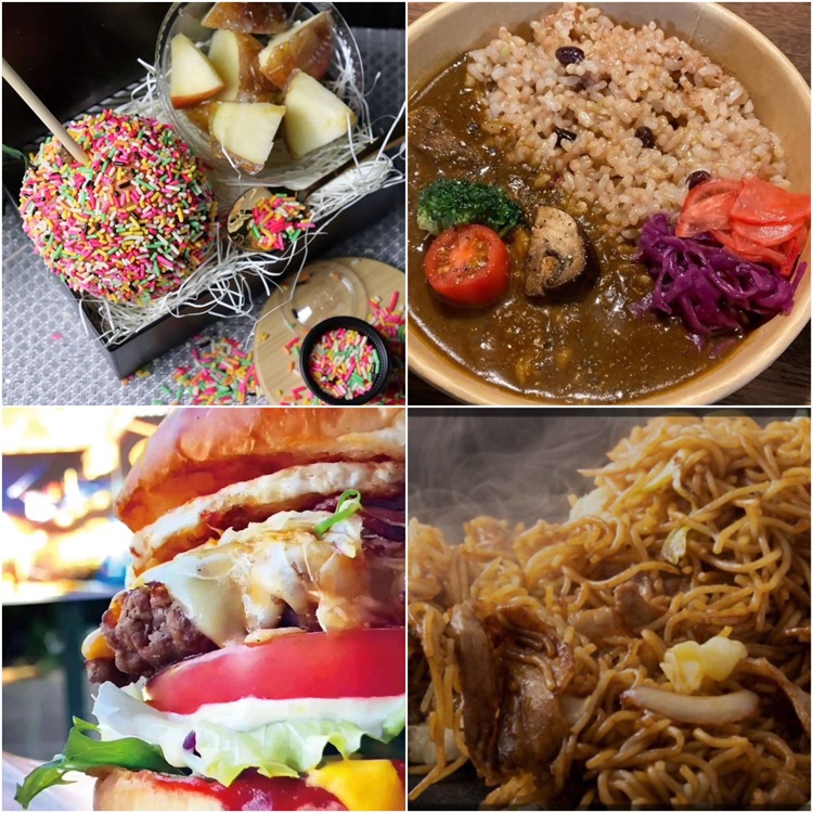コーヒー屋ひろっち(コーヒー、カヌレ)/はらぺこ(カレー)/天匠バーガー(ハンバーガー、豚バラ)/でんでん(焼きそば、たこ焼き)/マダラキッチン(ポテト、オニオンリング)/シーケバブ(ケバブ)/キャンディデコ(りんご飴)/ロックカフェ(クレープ)