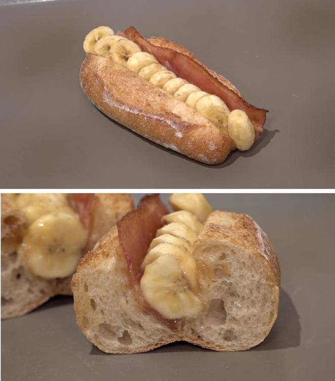 ピーナッツクリームを塗ったパンに、ベーコンとバナナを丸ごと1本、さらにハチミツをかけて焼き上げます。