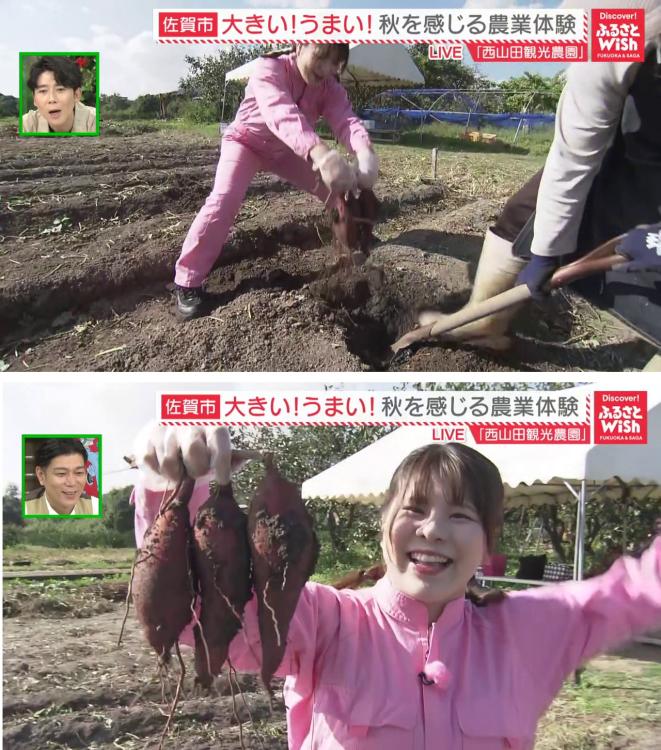 農園の池田勇介さんによると、こちらで育てているのは「紅おとめ」という品種。ホクホクとした食感と薄い皮が特長で、焼き芋やふかし芋はもちろん、いろんな料理に使いやすいそうです。 大川紫磨リポーターも、童心に返って「サツマイモ掘り」(1人700円 ※約1kg持ち帰り含む)に挑戦。