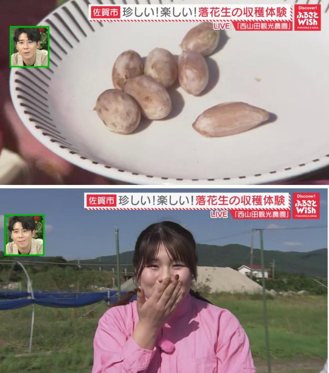 収穫したばかりの落花生は、塩茹でにしていただくのが1番おすすめなんだそう。普段見慣れた茶色い薄皮とは違い、掘りたては薄ピンク色です。「香りが豊か。食感もしっかりしていて、めちゃくちゃおいしい」と、口の中で広がる濃厚な味わいに大川リポーターも感動。