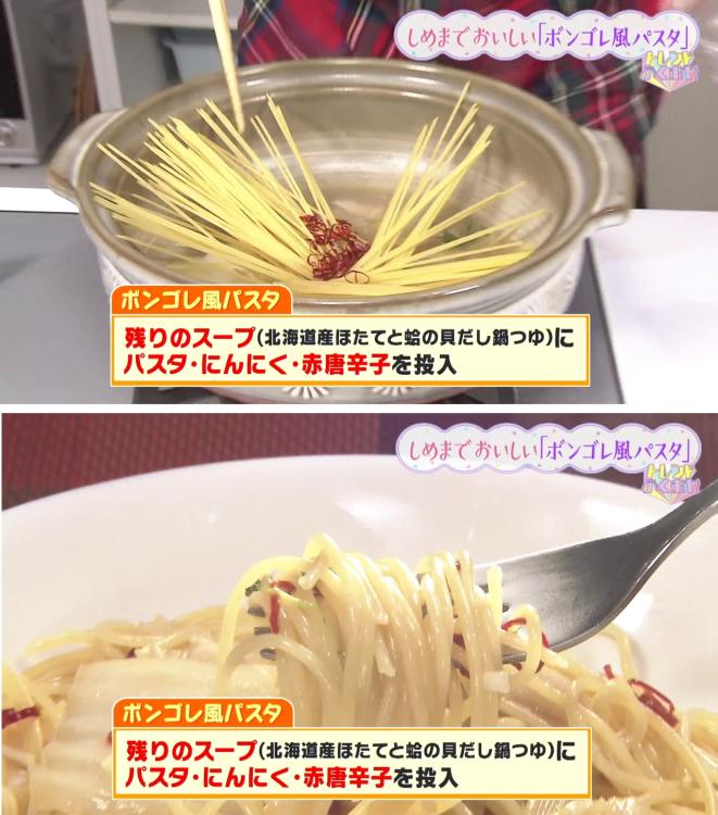 残ったスープに、パスタ、にんにく、赤唐辛子を加えて煮込むだけで「ボンゴレ風パスタ」の完成です。「いろんな具材の旨みを吸ってるから、よりおいしい!」と原リポーターも最後まで大満足。