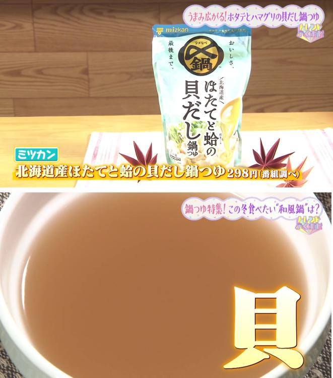 個性あふれる和風ダシの中から、原リポーターが「貝の風味がふんだんで心惹かれた」と選んだミツカンの新商品「北海道産ほたてと蛤の貝だし鍋つゆ」(298円・番組調べ)。