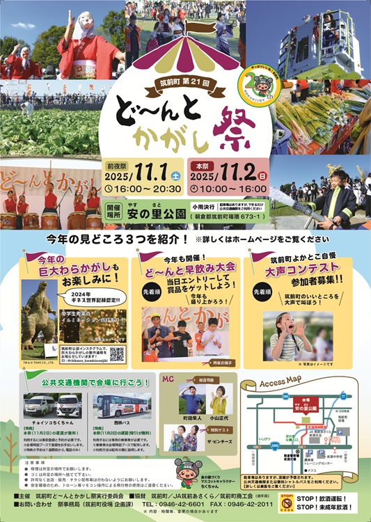 2日の本祭では夜須中学校と三輪中学校の吹奏楽部合同演奏、太鼓演奏、日向ひょっとこ踊りなどのメインステージイベントに加え、地元農家さんによる掘りたて新鮮野菜の直売や飲食ブース、物販の出店が並びます。