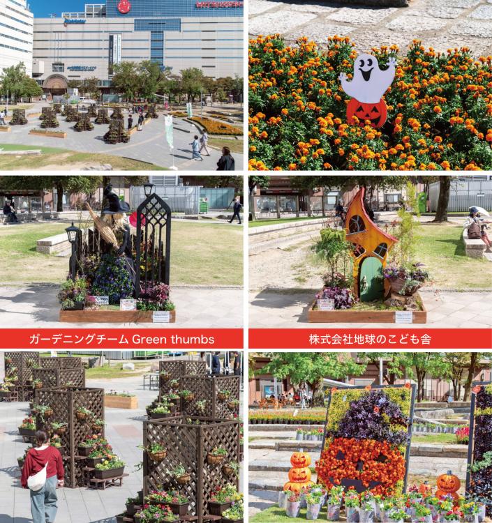 初日の29日(水)は、市民団体と一緒に花壇を作る企画や、市民花壇コンテストの結果発表などが行われ、最優秀賞にはガーデニングチームGreen Thumbsの「花の魔法使い」(写真左列・中央)、優秀賞には株式会社地球のこども舎の「ハロウィンと緑の妖精」(写真右列・中央)が選ばれました。