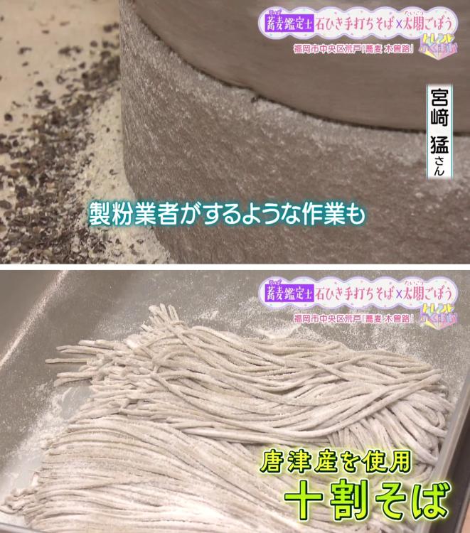 うきは、対馬、唐津、埼玉、五島産など、各地のそばの実を仕入れ、その日の特長を見極めながら加水率を変えているんだとか。 そばの香りを最大限に生かすために挽き方や粒度を変えて提供しているそうです。この日は、唐津産のそばの実を使った「十割そば」を仕込んでいました。
