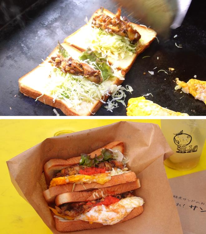 鯖煮にチーズ、明太子、タマゴをトッピングしたボリューミーなサンド!