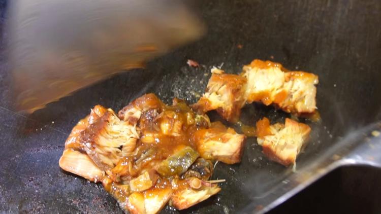 注文が入ると、鯖煮ととろみをつけた煮汁を鉄板で焼いていきます。