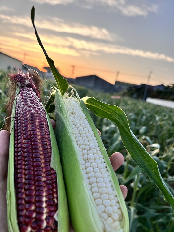日本初の赤色とうもろこしと、甘~い白とうもろこしの狩りたてを、畑で2本味わえます(もぎ取りは1本330円で持ち帰りOK。)
