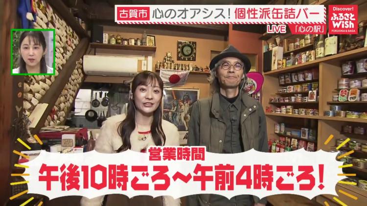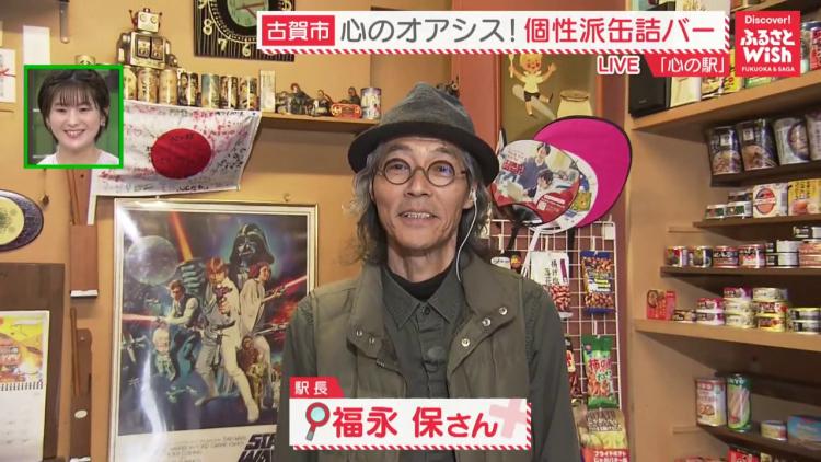 迎えてくれたのは、この道20年という駅長・福永 保さん。店内には定番から珍しいものまで、約120種類の缶詰がずらり。「昔はもっとあったけど、気合が入りすぎて疲れちゃった」と笑う駅長。店内にはライブのポスターなども貼られ、古賀の夜を愛する人々の憩いの場となっています。
