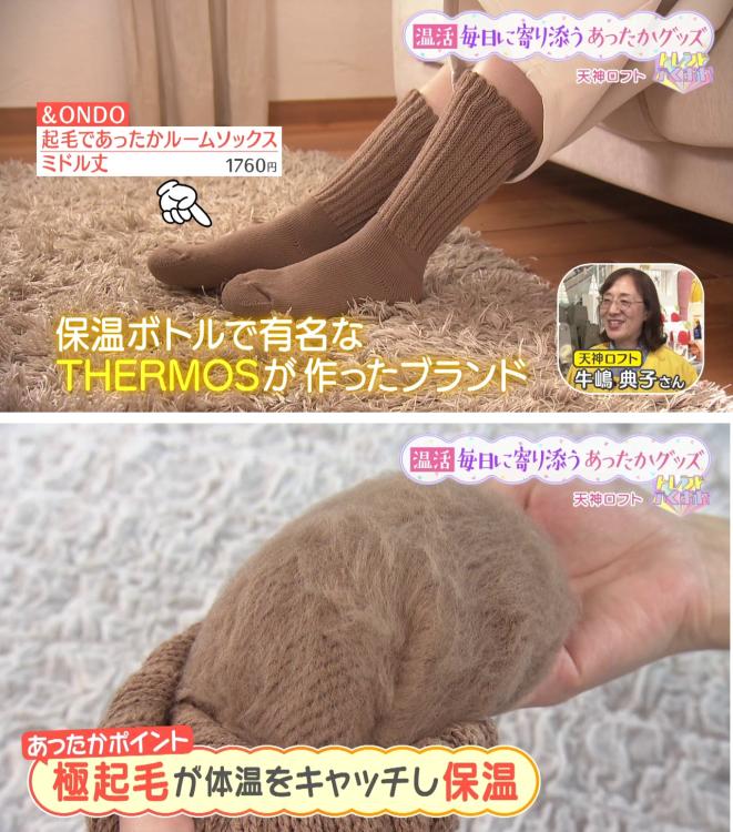 続いては、保温ボトルで有名な「THERMOS(サーモス)」が手掛けるブランド「&ONDO(アンドオンド)」の 「起毛であったかルームソックス ミドル丈」(1760円)。 一見普通のニットソックスですが、裏側は毛足の長い「極起毛」になっており、体温をキャッチして保温してくれます。 厚みがあるので床からの冷気もシャットアウト!