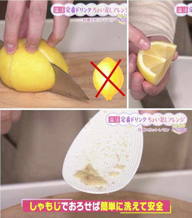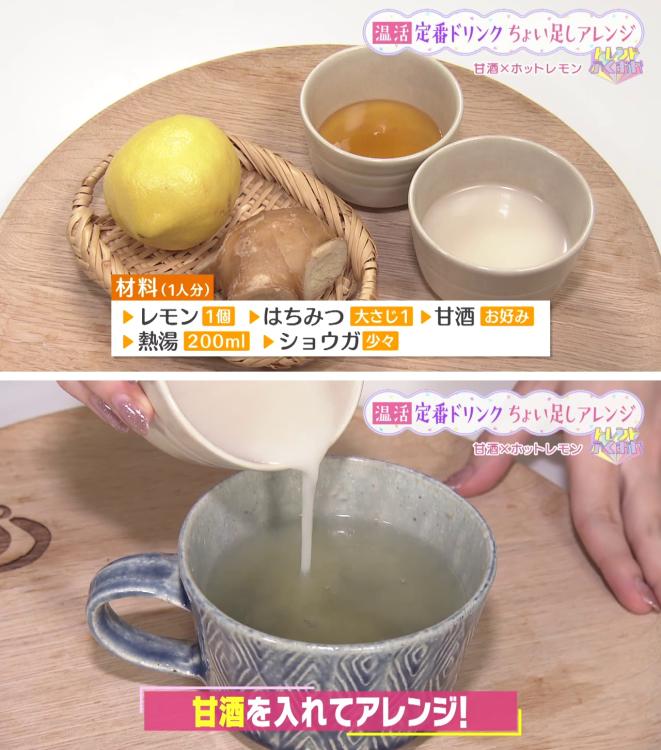 【材料】レモン1個/はちみつ大さじ1/熱湯200ml/ショウガ少々/お好みで甘酒