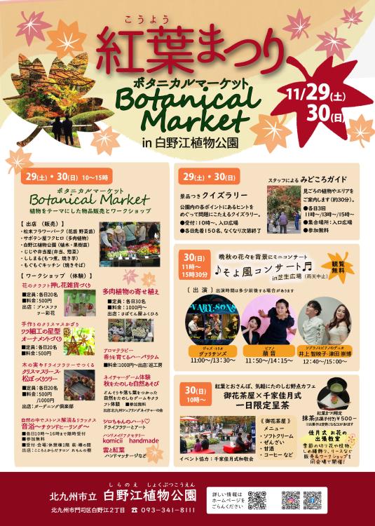 秋も深まり、木々が鮮やかに色づく季節がやってきましたね。北九州市門司区の「白野江植物公園」では、園内の約800本のイロハモミジが見頃を迎えるタイミングに合わせて、毎年恒例の『紅葉まつり ボタニカルマーケット』が11月29日(土)、30日(日)に開催されます。