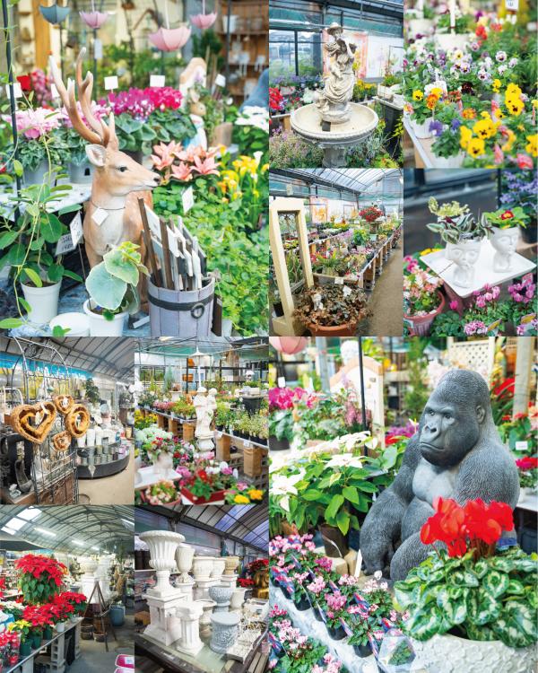 ここは知る人ぞ知る隠れ家的な老舗園芸店。広々とした敷地には、四季折々の花々や観葉植物が所狭しと並び、まるで植物園のような空間が広がっています。