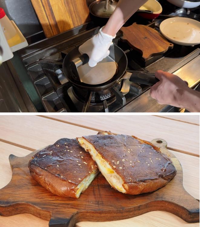 あえて生地をプレスして潰すことで、表面はパリッと、中はモチッとした食感に。 食べ応えも十分!