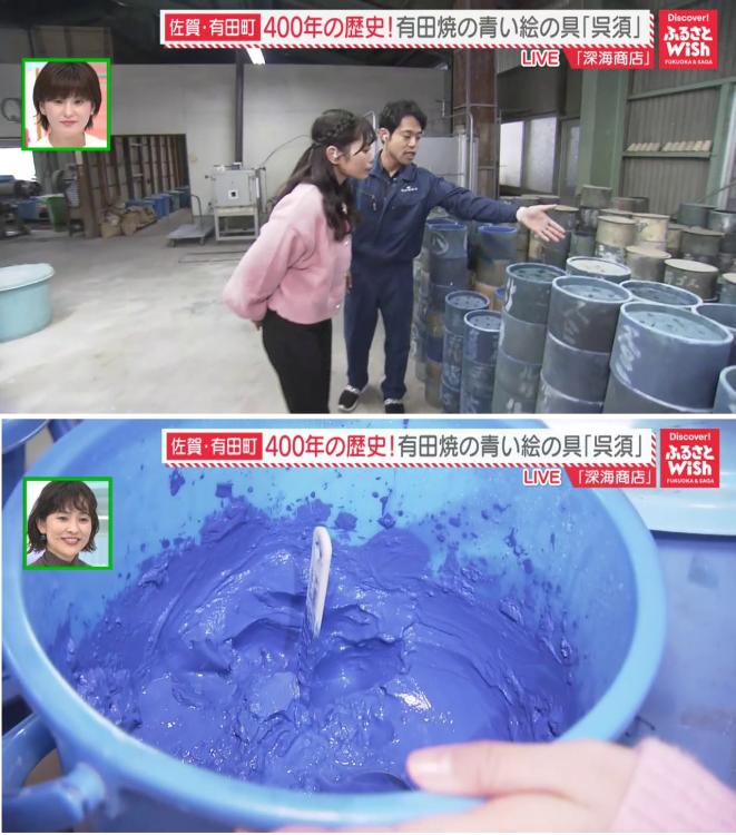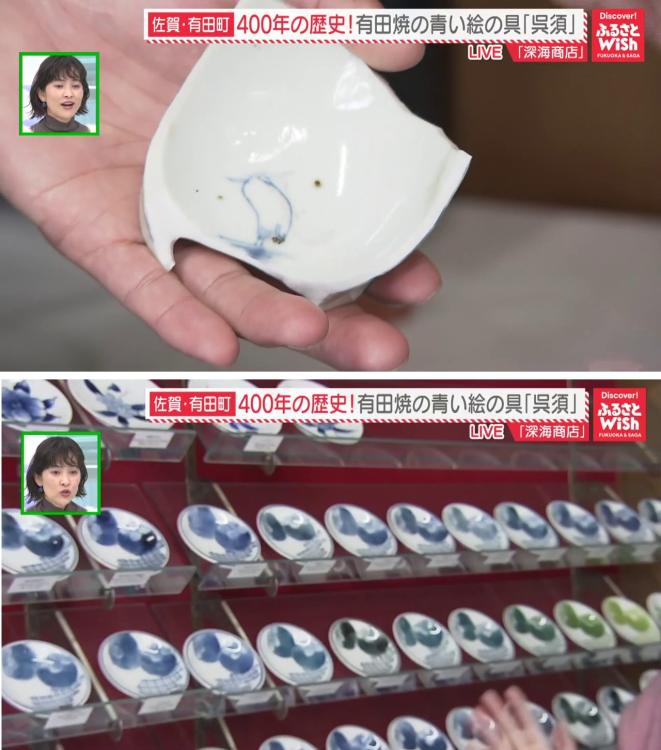 深海商店で取り扱う呉須は、コバルトを主成分とする原料を調合して作る絵具です。 井上桃子リポーターは、1630年代に作られたという古い器の破片を見せてもらい、400年前の青と現代の青を比較。現代の呉須は不純物が少なくなり、よりクリアな青へと進化していることがわかります。