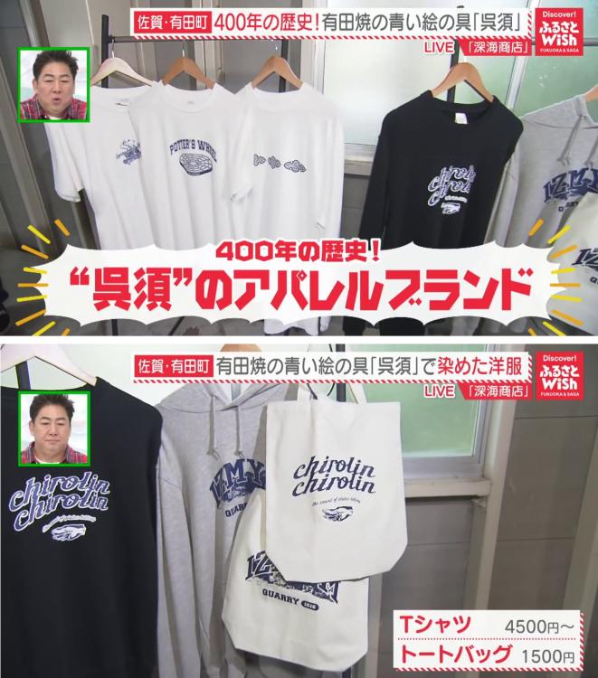 『深海商店』では、呉須の魅力を幅広い世代に伝えるため、ある新しい挑戦をしています。それが、呉須で染めた洋服を扱うアパレルブランドの展開です。伝統的な有田焼はシニア層に好まれがちですが、深海さんは若い世代にも興味を持ってもらえるよう、呉須の色合いを活かしたカジュアルなデザインに仕上げました。「Tシャツ」(4500円〜)「トートバッグ」(1500円)などがホームページで購入可能です。