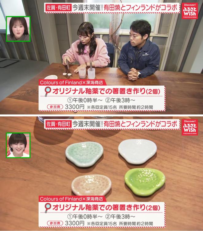 今週末12月6日、7日にはアリタセラで開催される『フィンランドフェアinSAGA シリーズ7』にも出展。フィンランドのデザインブランドとコラボレーションした「オリジナル釉薬での箸置き作り」(3300円/2個)の体験を提供します。