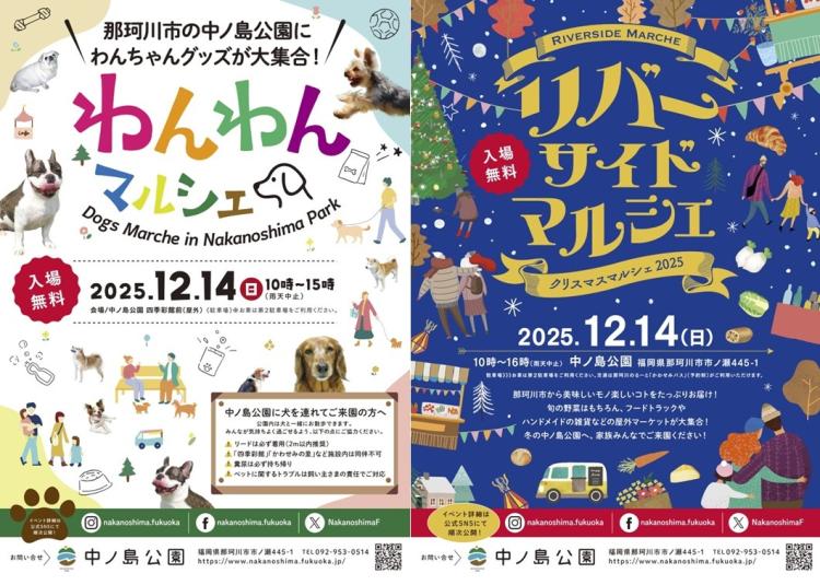 福岡・那珂川市の中ノ島公園に、12月14日(日)、冬の楽しさを詰め込んだマルシェがやってきます!今回は、犬好きにはたまらない『わんわんマルシェ』と、おいしいグルメや素敵な雑貨が並ぶ『リバーサイドマルシェ~クリスマスマルシェ~』が同時に楽しめる、欲張りな一日を過ごすことができますよ♪